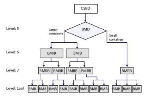 In ApFS the bitmap structures are common to all volumes in the container. Each volume has a quote of the blocks in the container but the blocks are not in dedicated areas. The BMS are referred to from the CSBD, that has information about the topmost level in the BMS, the Bitmap Descriptor (BMD). Picture below shows the basic structure of the complete BMS. The levels reflects the hierarchy where we have the BMD on the top setting the boundaries. At the bottom we have the Bitmap Blocks (BMB) that keep track of the blocks in the container. One byte in the BMB keeps track of eight blocks where each bit provides the allocation status. Each bit is the status of a single block.