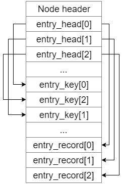 Nodes are flexible containers that are used for storing different kinds of entries. They can be part of a B-tree or exist on their own. Nodes can either contain flexible or fixed sized entries. A node starts with a list of pointers to the entry keys and entry records. This way for each entry the node contains an entry header at the beginning of the node, an entry key in the middle of the node and an entry record at the end of the node.
