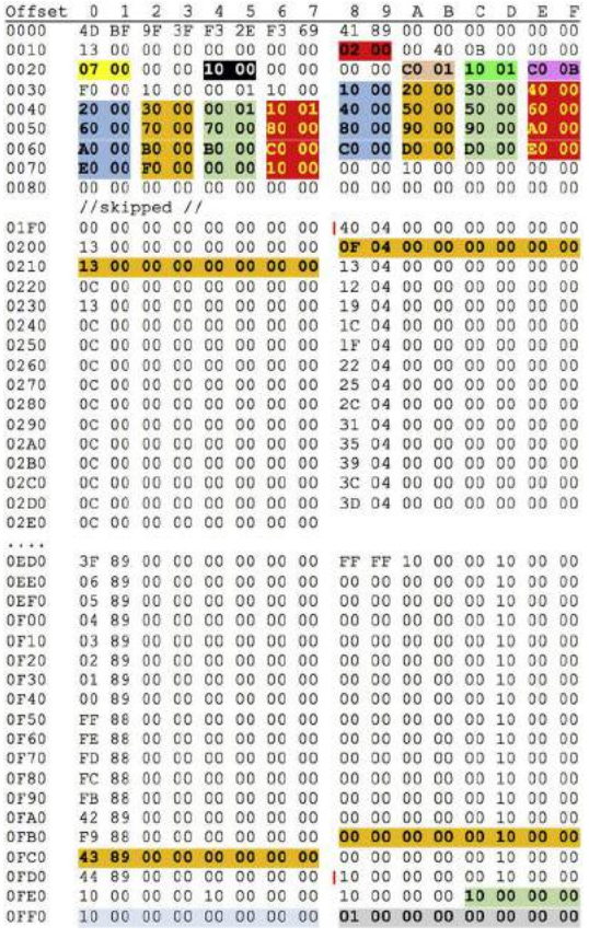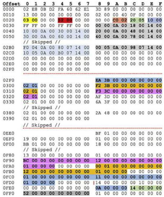 | 2E | tableFreeSpaceSize | uint16 | Size of the free area. The table data area ends at offset 0x38 + tableIndexSize + tableKeyAreaSize + tableFreeSpaceSize. 0x38 + 0x80 + 0x170 + 0xd58. |