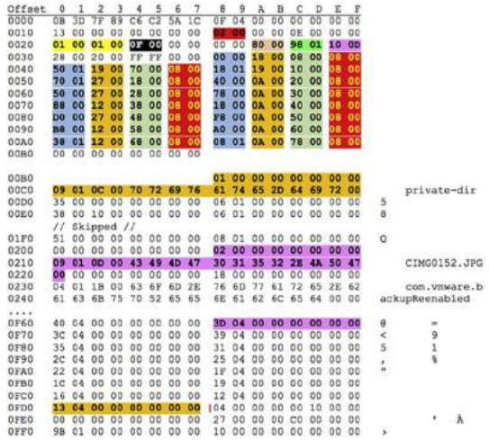Table TYPE 6 is very similar to TYPE 4. The table index has only the offset to content in the key and data section and not the length. The lengths are predefined. Each record is 16 bytes in both the key and data sections. There is no footer for this type of table. This type of table is often observed in the leaf nodes in the BTCS. Typical key section content includes Object ID and Volume Checkpoint Superblock ID while the data section typically records the size of the data and a block number.