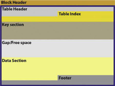 The 8 table types (0-7) have a lot in common and we will focus on this first. Then we provide a short description of each table type. The table definition commences at offset 0x20 in the block with table type, number of rows, size of key section and gap between key and data section. After the table setup the table row and column definitions are described from offset 0x38 in the block. The table contains a header, record definitions, key and data sections. Certain table types also have a footer. The header begins at offset 0x20 in the block and is 0x18 bytes in length. This table type header starts with a 16-bit value which represents the table type. This is then followed by two bytes representing the level in the B-Tree at which the table is used. The two subsequent bytes represent the number of rows in the table. The length of the record definition scan be found at 0x2A followed by an Uint16 which records the length of the key section. This is followed by the gap between the key and data section. The table footer is always 0x28 bytes and always occupies the end of the block. Table indices are of 4 or 8 bytes each. On 8 byte indices the two first Uint16 are the offset and length of the key record. The next two Uint16 are the offset and length of the data record in the table. Tables with 4 byte indices have two Uint16 values which is the offset to the key and data record. The data length in the two records are predefined. In tables with a footer the offset to the data record is relative to the start of the footer (0x28). And for the other table types it is relative to the end of the block.
