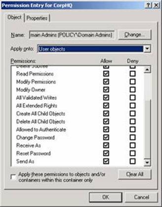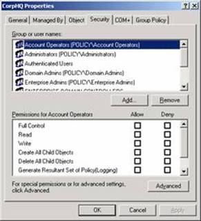 To see the power and control that NTFS provides for access control, it is best to investigate the permissions of an OU (Organizational Unit) within Active Directory. The figure below shows permissions for a typical OU.